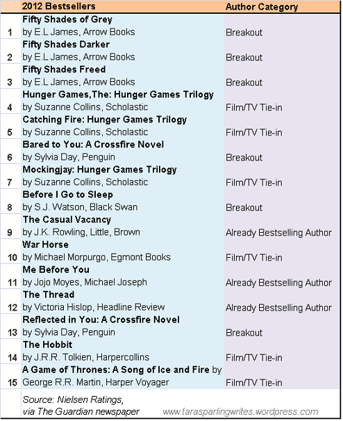 The Hunger Games was already a success when first published in 2008, but in 2012 Suzanne Collins was named the bestselling Kindle author of all time. It’s hard to know whether e-books made a huge difference, or whether the release of the The Hunger Games film was solely responsible for sales revival and her 2012 bestselling status (hence the categorisation of “Film/TV tie-in” above). But given her target readership and the fact that teen/adult crossover novels tend to do particularly well in e-book format, e-publishing can’t have hurt.