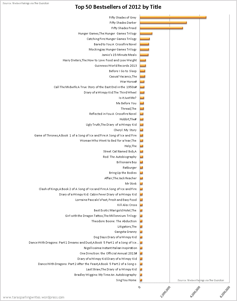 However, having said this – and I won’t keep on repeating it for fear of ad-nauseating the whole lot of you – we need to bear in mind that according to Bertelsmann, the owner of Random House, E.L. James’ publisher, over 70 MILLION units of the 50 Shades trilogy were sold between March and December 2012 through paper, audio and e-book format in English, German and Spanish. When you see that, 10.5 million imprints seems like a stodgy and belatedly unwanted starter. In addition, if Suzanne Collins was named the bestselling Kindle author of all time in 2012, looking at paper book sales is hardly going to tell us accurately where readers’ money went last year.