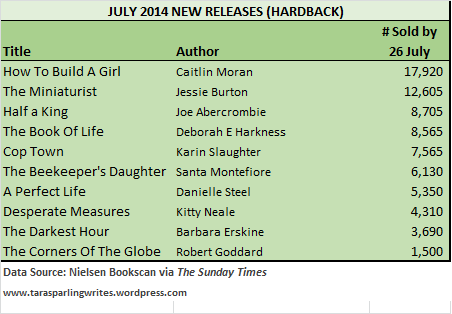 Although I hate to admit it, the numbers don’t give the full story, because they’re only a snapshot at the end of the month, at which point some of the books would have been out already for 4 weeks – whereas some of them had only been released in the last week of the month. Danielle Steel’s book was only released in mid-July; Caitlin Moran’s in the very first week.